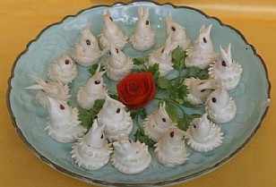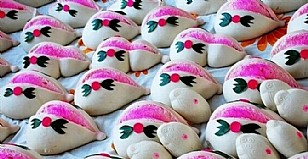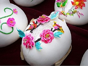 办丧事时,当地人还要捏制一种在灵堂前面供奉的“小食儿”面塑。这种面塑捏成各种花果、小动物形象,甚为精巧别致,有的蒸熟后点染,有的晾干后点染。