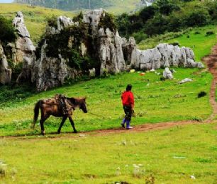 韭菜坪景区由贵州屋脊韭菜坪(海拔2900.6米)、洛布石林(总面积1500亩)、民族村寨红星村、风力发电、天坑五部分组成。景区集高山草场、石林溶洞、彝族风情为一体,非常适合开展以”登贵州屋脊、体验高原风光、品味彝族文化”为主题的休闲度假体验游。
