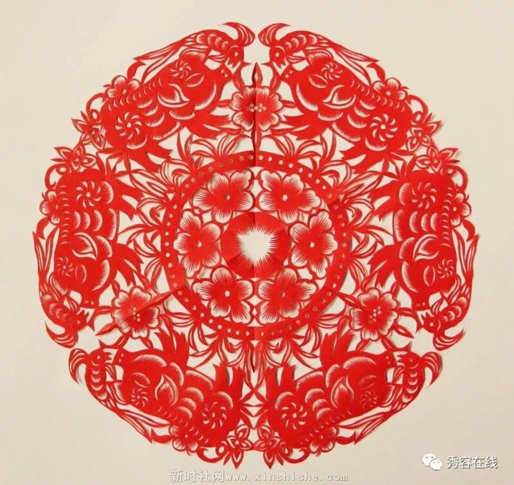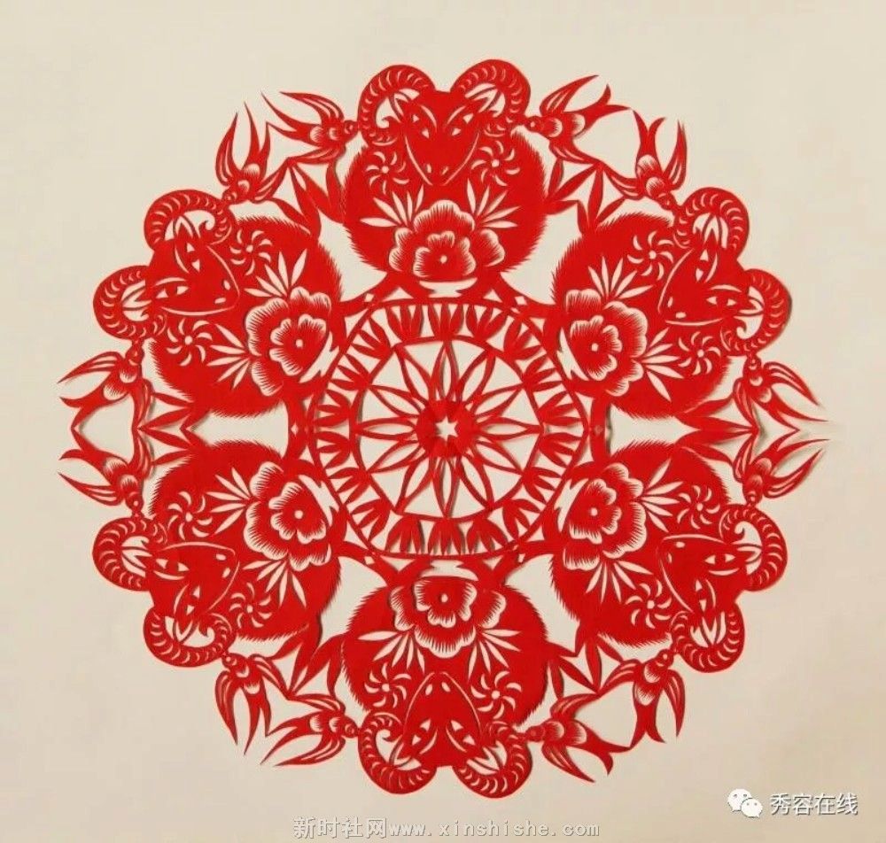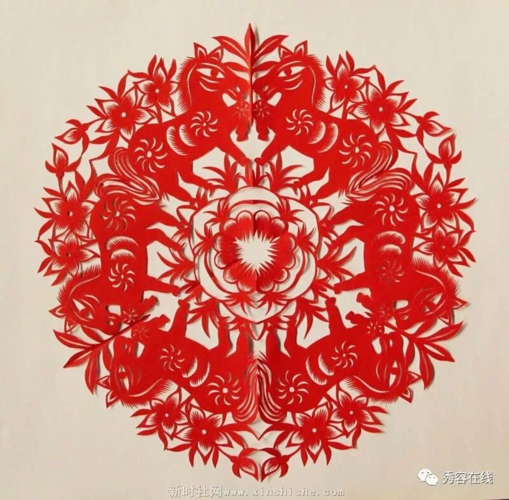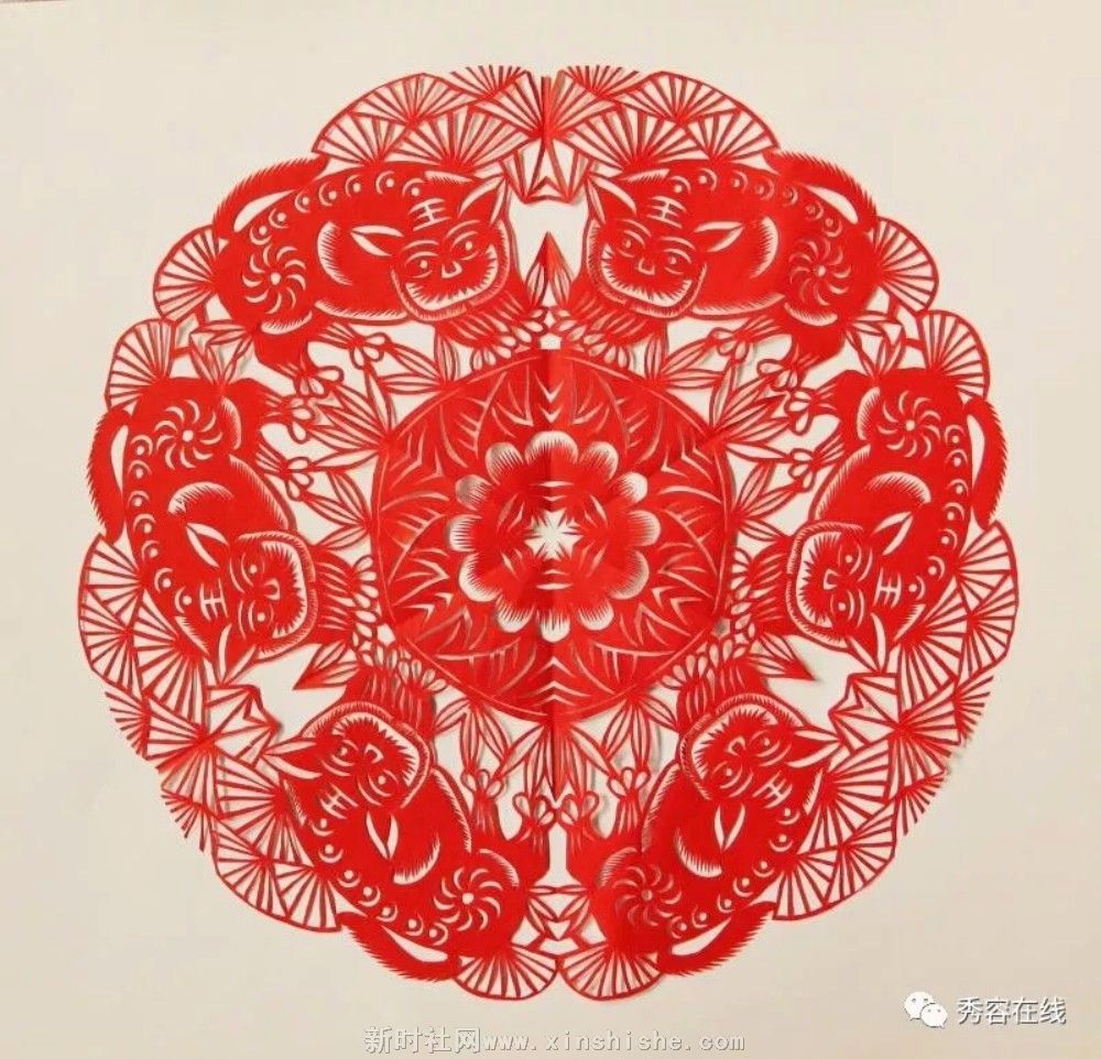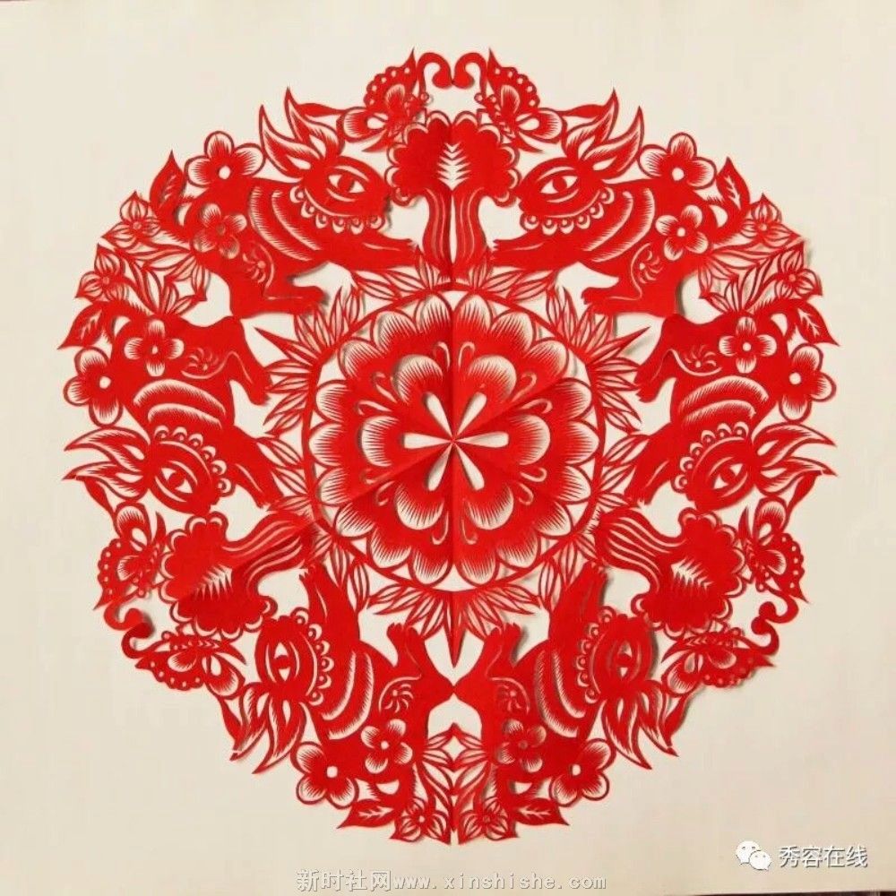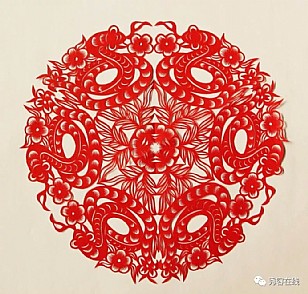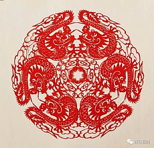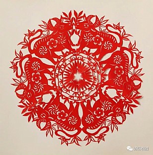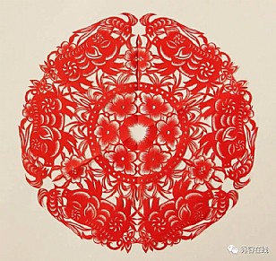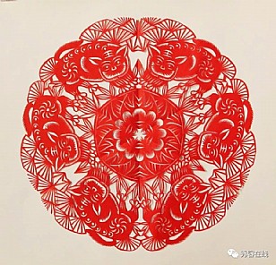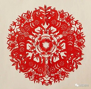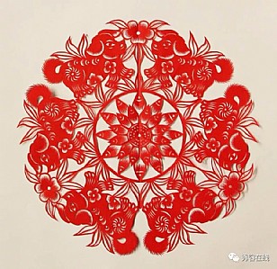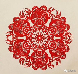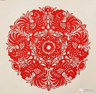 殷润清,女,山西省美术家协会会员、山西省工艺美术家协会会员、忻州市美术家协会理事、忻州市民间文艺家协会会员、忻府区民间艺术家协会负责人。 剪纸是古老的汉族民间艺术,春节期间,在中国广大的地区都有贴剪纸的传统。 剪纸团花作为剪纸的一种布局格式。呈圆形花样、四面均齐。这种装饰格式在剪纸中尤能显示其优异性,由于纸张可折叠,如对角折叠二次、三次、四次不等,便可剪出四面均齐的团花。我国最早的剪纸实物,新疆出土的北朝时期剪纸,即为团花格式,如“对鸟团花”、“对猴团花”、“八角形团花”、“忍冬纹团花”、“菊花纹团花”。可见团花格式是剪纸中最为古老的格式。