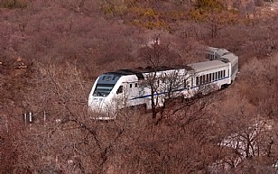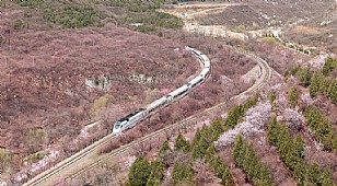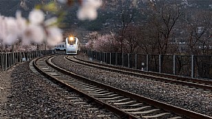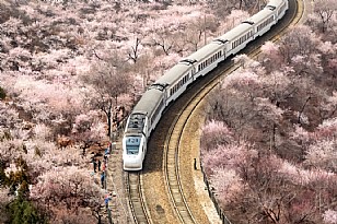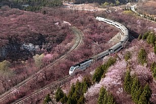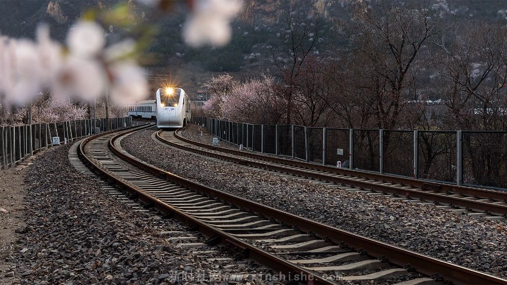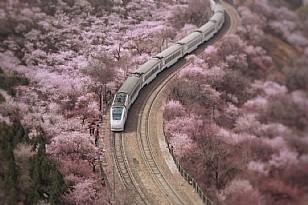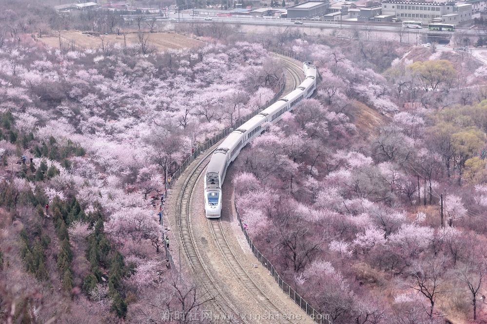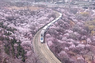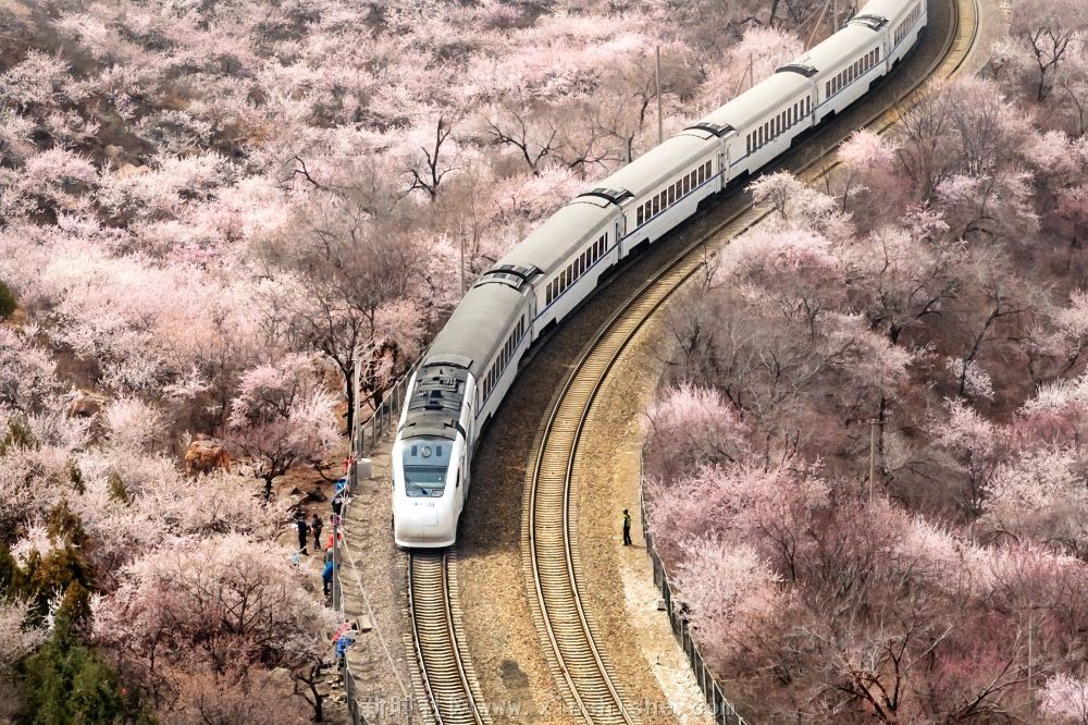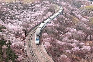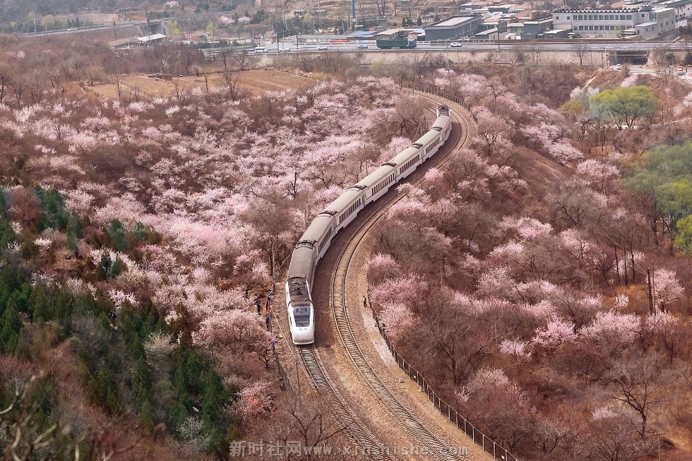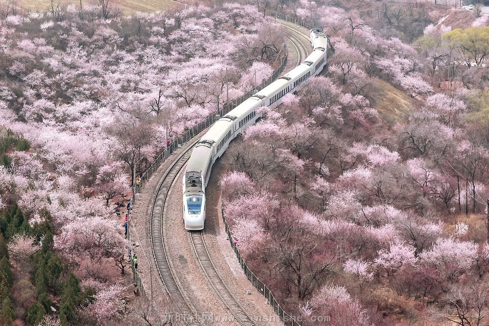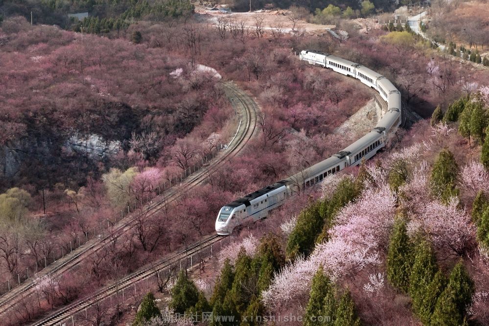 火车穿行沐春暖,欢歌笑语赏飞花。