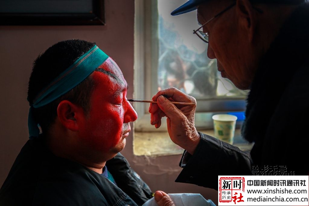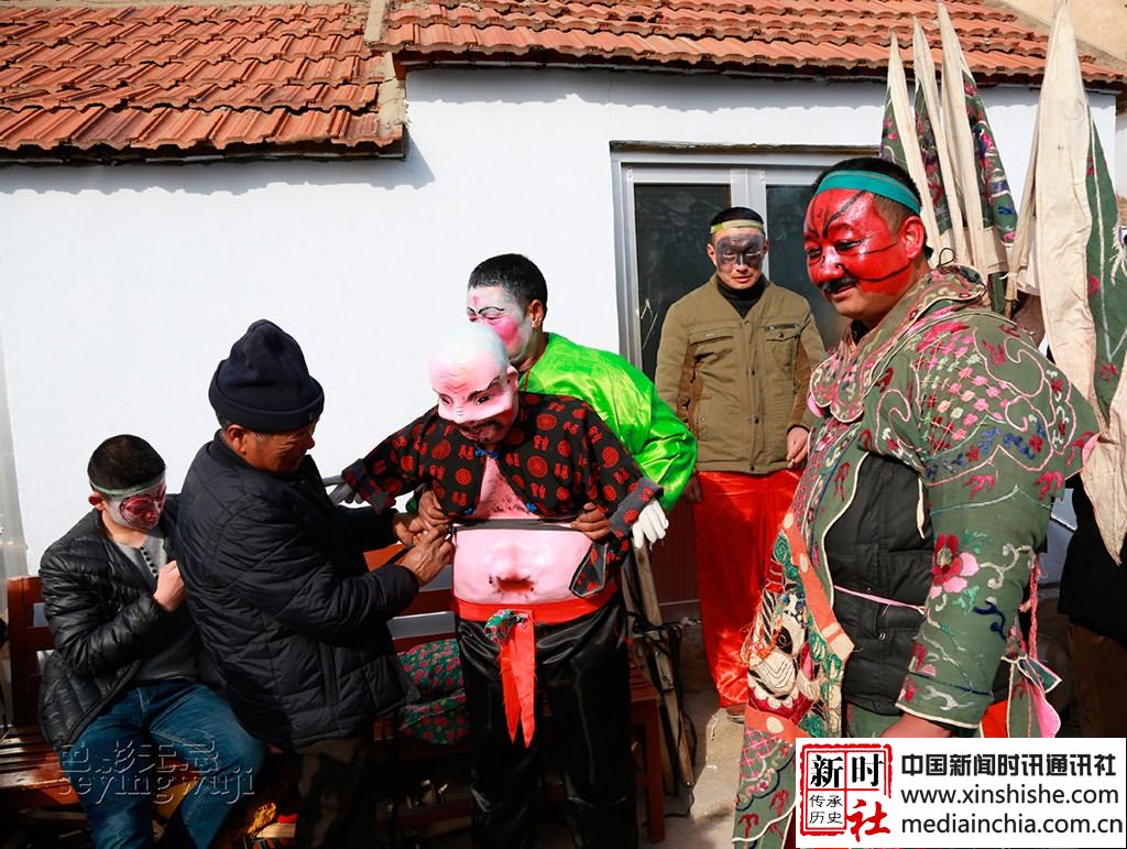 大峪村“送火神”仪式之所以年年受到广泛关注,主要是因为游行队伍角色繁多,浩浩荡荡,都化彩妆。游行队伍之所以角色繁多,是因为村中老几辈人积淀了近百年的大戏班子,他们唱大戏时留下来六大箱戏服,用这些戏服妆扮起来,绚丽多姿,极为惹人注目。他们能够按人物角色为年轻人妆扮戏服并画上脸谱,目前主导游行队伍的人基本上是六十岁以上的老年人。