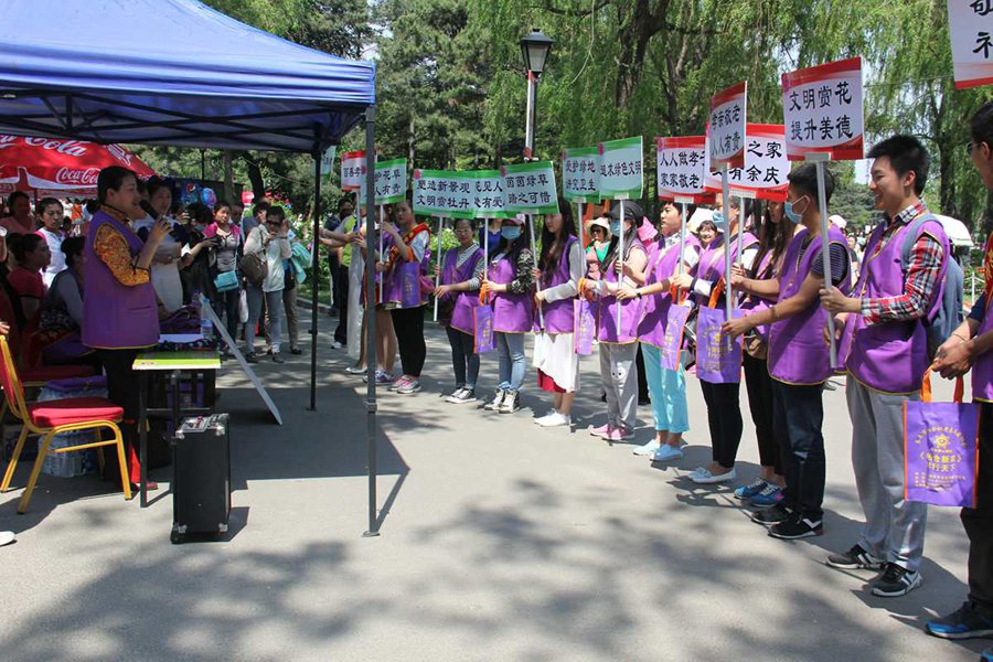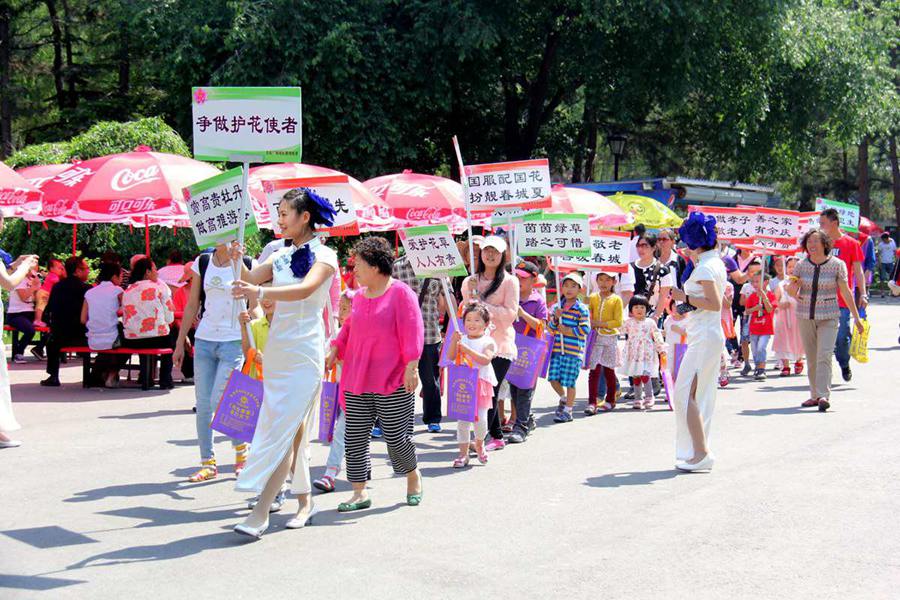 牡丹盛开,争奇斗艳。近几天长春市牡丹园游人如织,在游客周围出现一队一队的志愿者,宣传爱护花草,保护环境,拣拾垃圾,劝阻不良行为。这些是长春市柏合助老志愿者协会发起并组织的。在会长李桂梅的带领下,市民、退休职工、在校大学生,少年儿童和家长,都积极地参与这项公益活动。他们的口号是“垃圾不落地,争当文明人”,“孝亲敬老,善暖春城”。他们伴随着“三大纪律八项注意”的乐曲,举牌宣传社会新风,拣拾丢弃的垃圾。人们都投来赞许的目光,有的还用相机手机给他们拍照。他们还宣传孝亲敬老,弘扬中华民族的传统美德,并组织了万人孝亲长卷的签名活动。