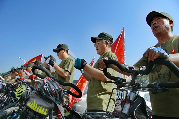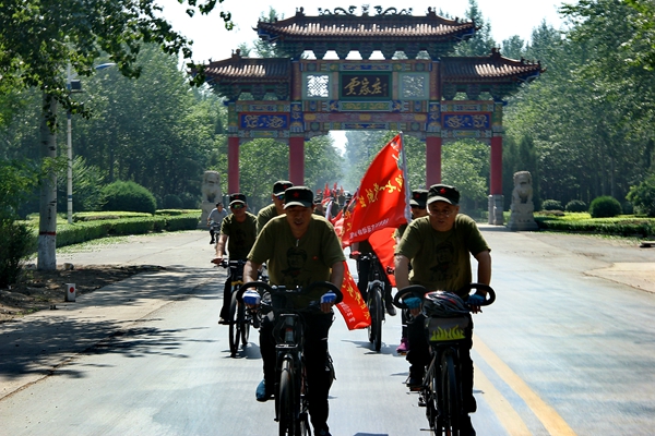 上午10时,全体人员在汾阳贾家庄红色纪念馆前合影,并齐唱“大海航行靠舵手”。之后骑行至距市区10多公里的张家堡红色教育宣传基地。