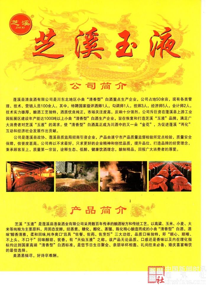 四川省遂宁市蓬溪县芝溪酒业有限公司是四川第一家多粮复合酿造“清香型”白酒生产企业,技术实力雄厚,酿酒工艺独特,酒质优良纯正,反响十分强烈。公司采用数百年传承的酿酒秘方和传统工艺,以高粱、玉米、小麦、大米等纯粮为主要原料,用固态发酵,经蒸煮、糖化、醇化、蒸馏、陈化精心酿造而成的小曲“清香型”白酒,酒味“醇香清雅、柔和回味、纯净爽口”且具“佐餐、佐药、佐烹饪”三大功效,品质口味独特,即“顺心、顺喉、不上头、不口干”回味醇甜、犹香,有“天仙玉液”之称。