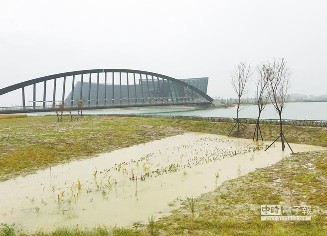 台北故宫南院外的景观园区虽尚未完工,但部分低洼地区积水严重。图片来源:台湾《中时电子报》