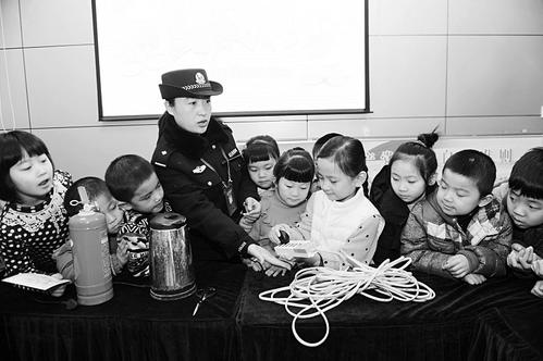 2月21日,在太原市南海二社区,民警正在教孩子们怎样正确用电。据了解,为了确保孩子们用电安全,该社区特意请来辖区民警给大家介绍怎样正确使用插销、电热水壶、电暖器等。