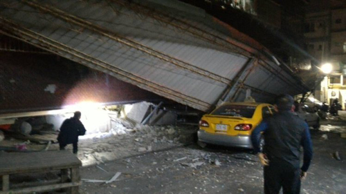 凌晨地震造成台南市新化京城银行大楼倾倒。来源:台湾《联合报》
