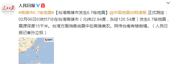 【环球网综合报道】人民日报微博消息称,2月06日03时57分在台湾高雄市(北纬22.94度,东经120.54度)发生6.7级地震,震源深度15千米。台湾方面消息说震中在高雄美农,另有消息说台南有楼倒塌。福建等多地网友表示震感强烈。