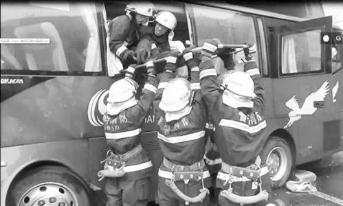 经过20分钟的紧张救援,位于大巴车中后部的4名伤员被成功救出。由于车头部位严重变形,处在这个位置的3名乘客被变形的座椅死死“咬住”,救援官兵全力以赴用液压破拆工具组对座椅强行破拆,扩大救生空间。