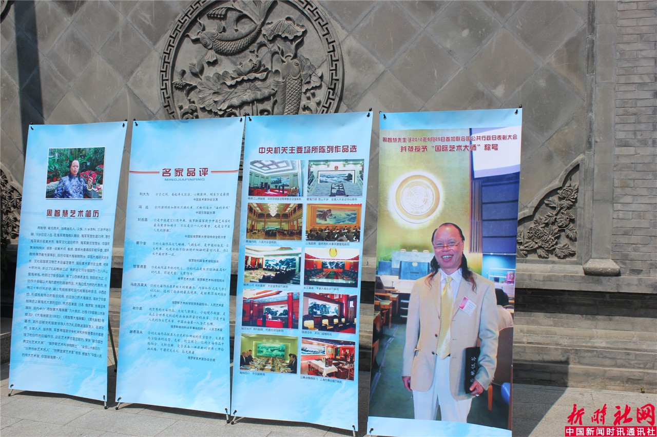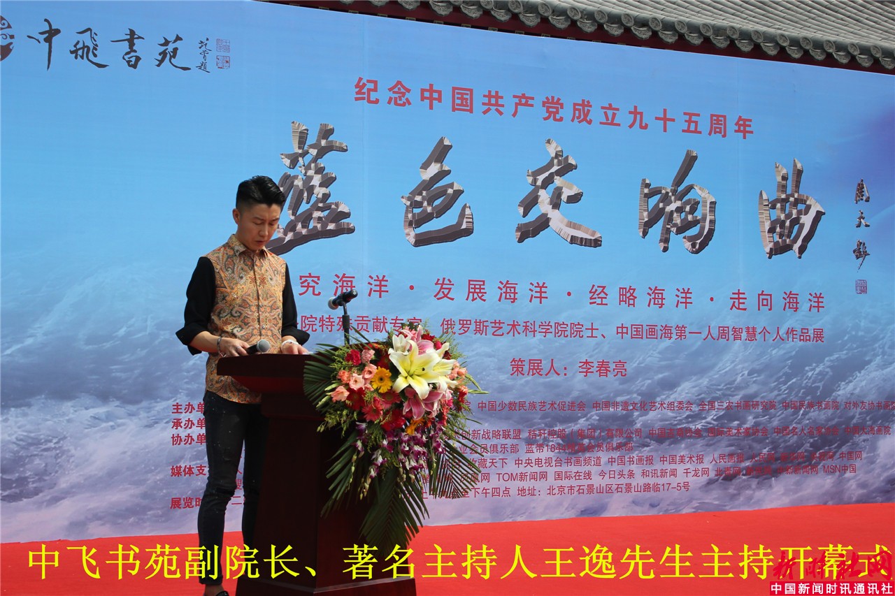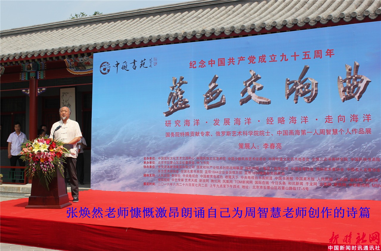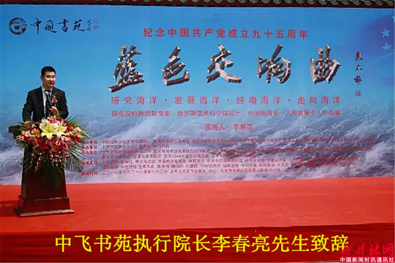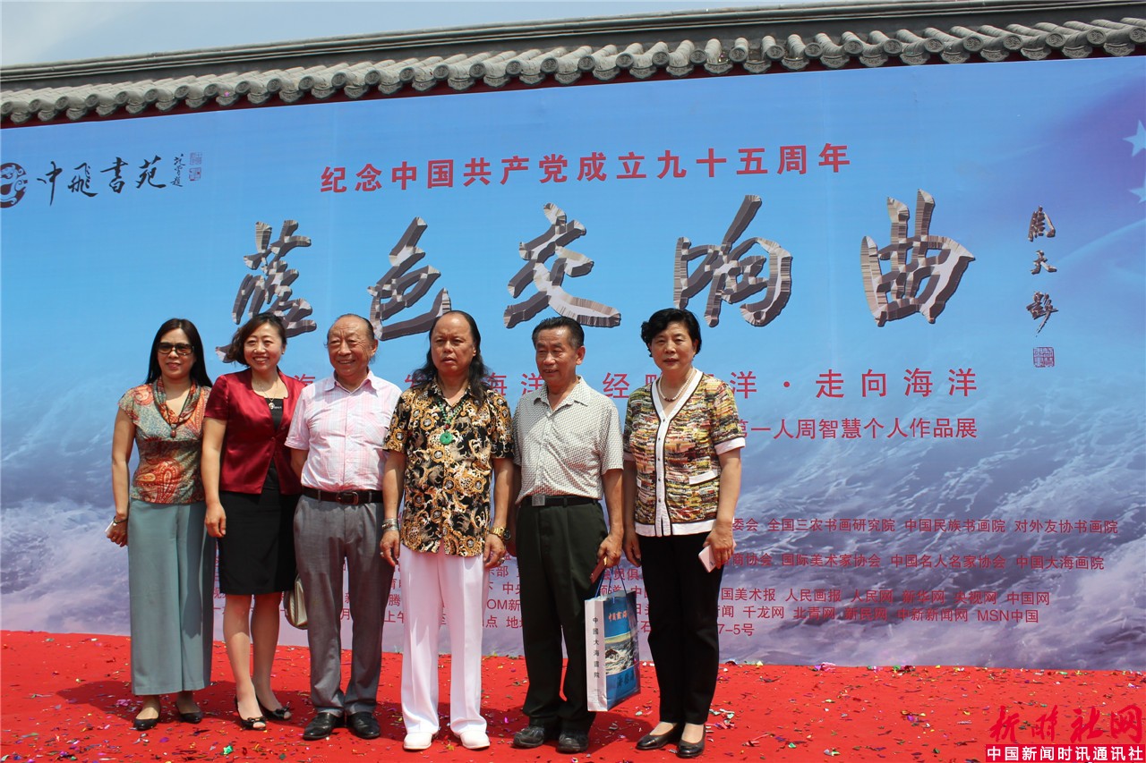 本社特约记者宋洁报道:为庆祝中国共产党成立九十五周年,6月26日由中国国际文化交流中心、中国少数民族文化艺术促进会、中国非遗文化艺术组委会、中国民族书画院,北京市石景山区文化委员会、中飞书苑(北京)文化传媒有限公司,吉商资本管理集团有限公司、国家秸秆产业技术创新战略联盟、中国吉商协会共同创办的“蓝色交响曲—国务院特贡专家、俄罗斯艺术科学院院士、中国画海第一人周智慧个人作品展”在北京中飞书苑隆重开幕。出席开幕式的嘉宾有国家新闻出版总署原副署长张乐群先生,原军事博物馆馆长郭得河先生、原总参政治部主任汪孔周先生、中国当代著名书法家、教育家、电影艺术家姚俊卿先生,中飞书苑执行院长李春亮先生、中国三峡书画院院长周森先生、原民族文化宫主任刘宝和先生、北京市石景山区书法家协会主席杨文华先生、美国孔子学院教授、著名书法家爱新觉罗·焘平先生、中国电力董事长陈朝辉先生、吉商资本管理集团总裁谢挺夫先生、原公安部纪委副书记沈淑敏女士、湖南大汉集团总经理付小林先生、周智慧胞弟著名画家周文华等。本次画展共展出周智慧老师作品50余幅,展期7天,展览持续至7月2日。