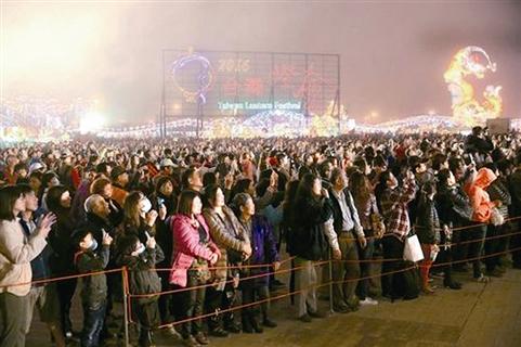 为争睹台湾灯会最后一天盛况,下午3点人潮涌入,入夜后主灯区附近挤满人,等着看齐天创鸿运360度灯光秀,不少人拿出手机拍摄,记录灯会最后一刻。