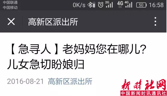 记者了解到:民警姜波接到求助后立即组织警力多方寻找老人,同时紧急启用高新区派出所的微信公众平台发布消息:“【急寻人】老妈妈您在哪儿?儿女急切盼娘归”