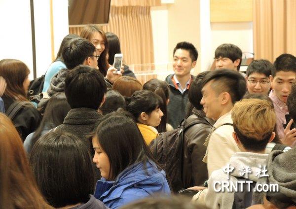 蒋万安座谈会后,有许多学生前往合照。图片来自中评社