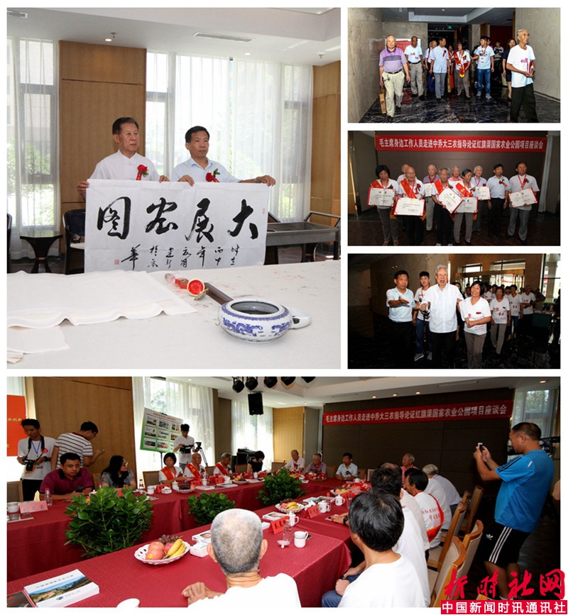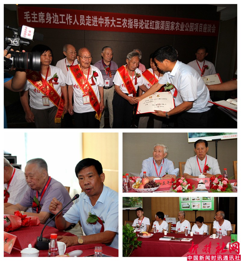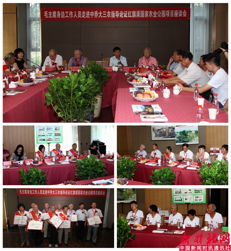 2016年8月19日,秋高气爽,艳阳高照,位于小汤山现代农业科技示范园东区中乔大三农实业股份有限公司会议室内气氛热烈,掌声阵阵。“热烈欢迎伟大领袖毛主席身边工作人员走进中乔大三农集团指导红旗渠国家农业公园项目”和“尊重老干部就是尊重党的光荣历史”的横幅十分醒目。毛主席身边的工作人员走进中乔大三农实业集团,指导论证红旗渠国家农业公园项目座谈会在这里圆满举行。毛泽东主席卫士、理发师周福明,毛泽东主席警卫员刘纪春,毛泽东主席警卫员、保管员张正午,毛泽东主席警卫员杨银禄、毛泽东主席专列列车长李建新出席,红旗渠特等劳动模范任羊成、李改云、郭秋英、李天德以及中乔大三农集团公司员工30余人参加了会议。红旗渠总设计和总指挥、原林县县委书记杨贵同志下午专程到会并与到会人员亲切交谈。