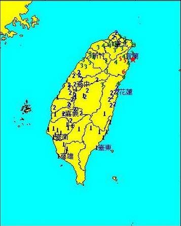 地震区域示意。图中☆表示震中位置,阿拉伯数字表示震度。震度4级即表示中等烈度地震,震度6级即表示强烈度地震。(图片来源:台湾气象部门网站)