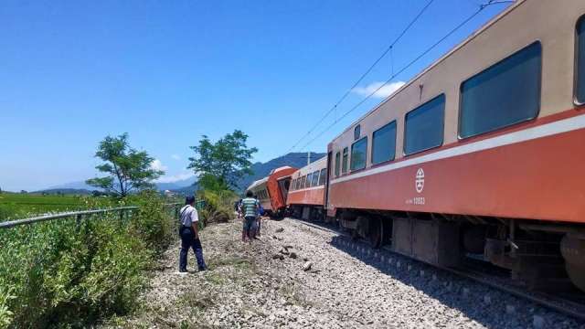 6月4日中午台铁莒光号651次在东竹富里间发生出轨,经现场回报共6辆车厢出轨,为第2车至第7车,幸无乘客受伤。(台铁提供)来源:台湾中央社