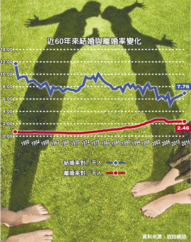 台湾近60年来结婚与离婚率变化。(图片取自网络)