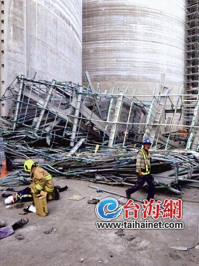 劳检处表示,配合荣民工程公司在台电公司大林发电厂进行筒式煤仓工程施工,7名工人到场进行工地鹰架搭建,下午2时15分工程收尾,快完成的鹰架疑因下层松脱软脚应声倒塌,当时在顶层作业的工人当场随倒塌鹰架坠落,其中一人被压在鹰架下方当场死亡,一人送医途中宣告不治,另5人伤势也不轻。