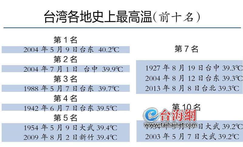 气象部门表示,过去台北6月最高温纪录为37.8℃,1日全台高温炎热,大台北地区由于西南风沉降,中午高温飙到37℃以上。当天全台最高温是台北14时46分的38.7℃,中午12时09分台东大武38.3℃位居第二。
