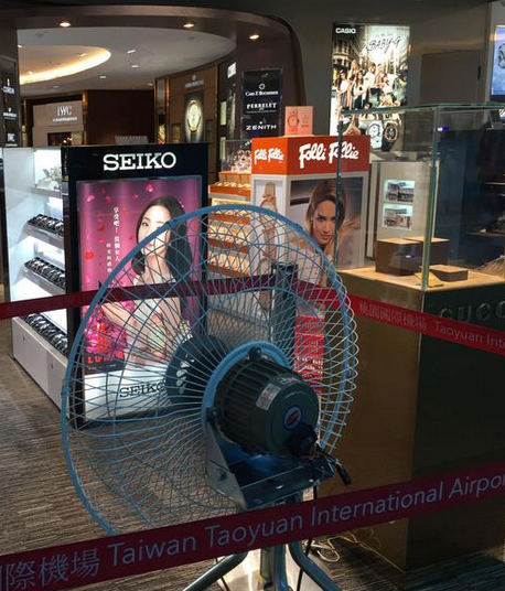 中国台湾网6月13日讯 台湾桃园国际机场状况不断,先是水管被挖断导致机场一、二航厦停水,二航厦又遇空调冷水管爆裂,制冷系统故障,旅客暑热难耐,免税店不得不将已收进仓库的大风扇搬出来救援。