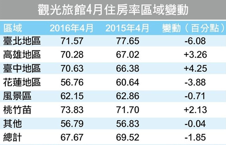 据台湾《联合报》报道,台湾交通部观光局公布观光旅馆统计月报,4月全台住房率衰退约两个百分点,其中大台北地区(涵盖台北市、新北市及基隆市)住房率大跌六个百分点,堪称重灾区。饭店业者认为,时值新旧当局交接,商务、旅游市场普遍观望,未来三个月市况仍然低迷。