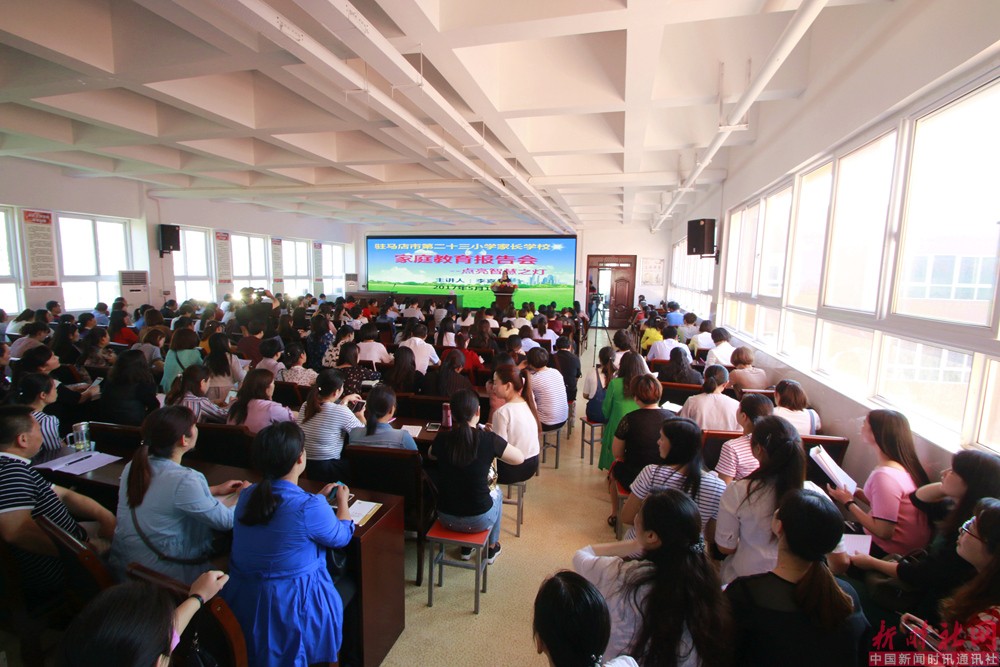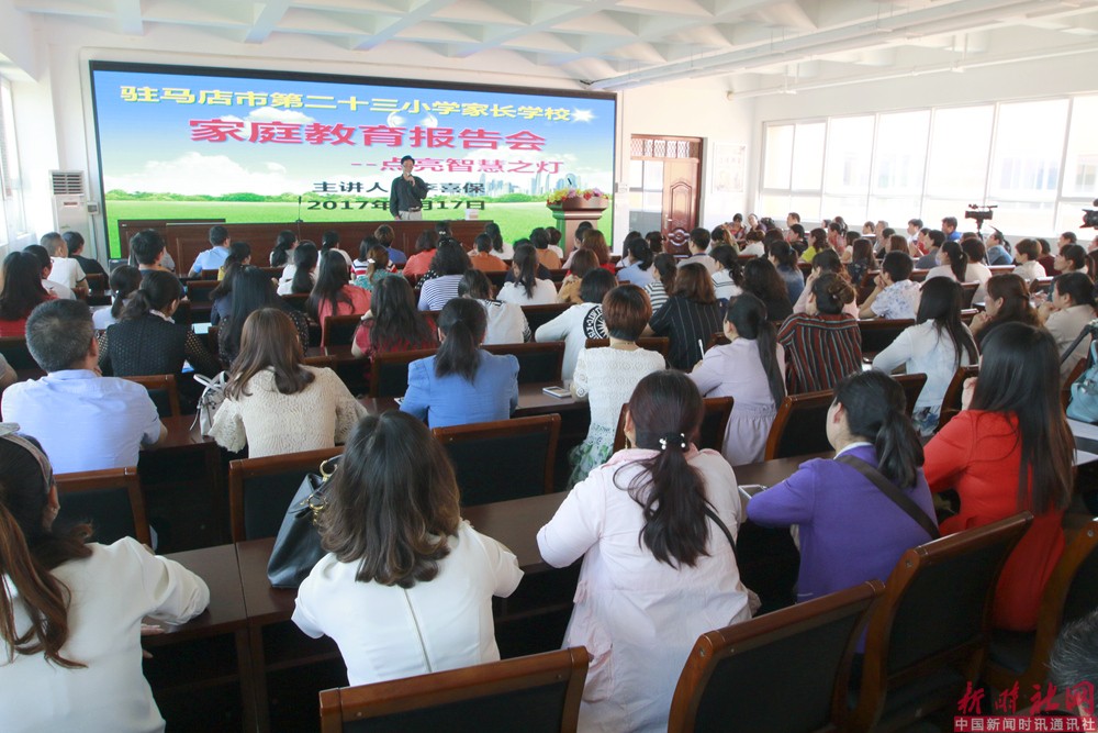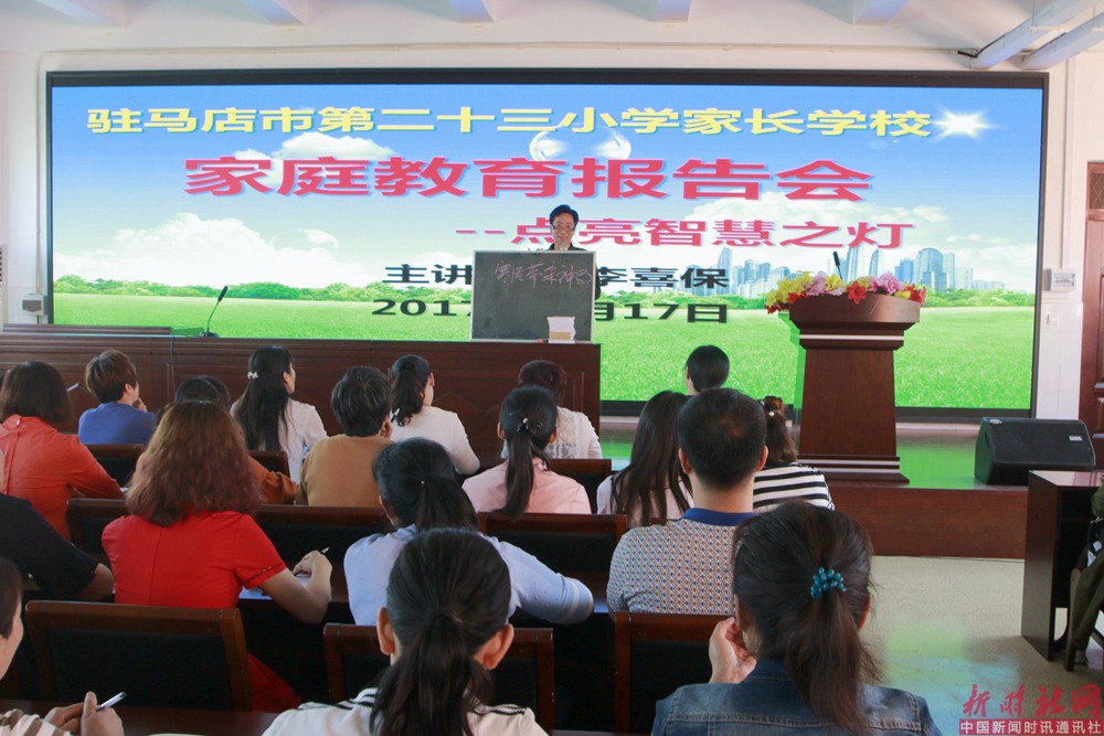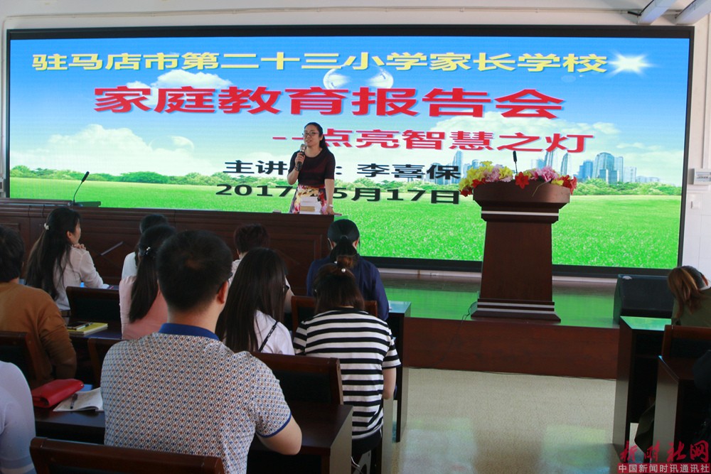 5月17日上午九点,河南省驻马店市23小学家长学校《点亮智慧之灯》家庭教育报告会在学校报告厅举行,近200名学生家长代表到会,沈书平校长及校领导班子,全体班主任参会,邢艳玲副校长主持会议并致辞。简洁明快的精彩发言,引来阵阵喝彩。