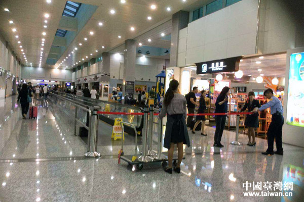 机场人员封锁手扶梯一侧淹水过道,并关停手扶梯。