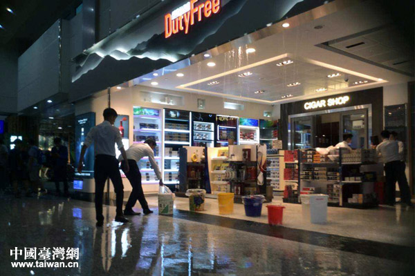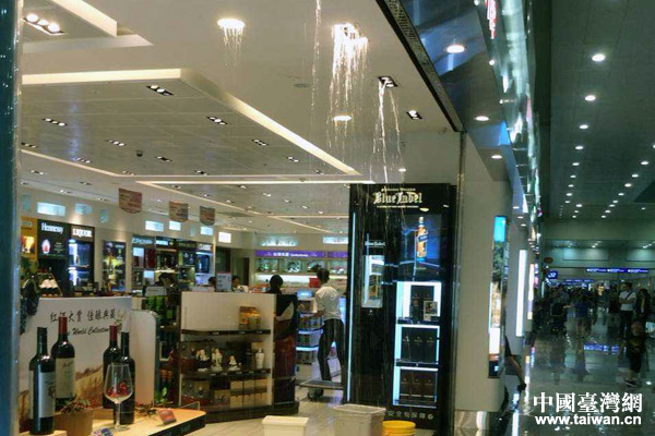桃园机场内免税店天花板上下起了大雨。