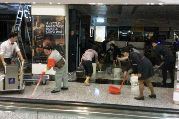 机场人员清理机场内积水地面。