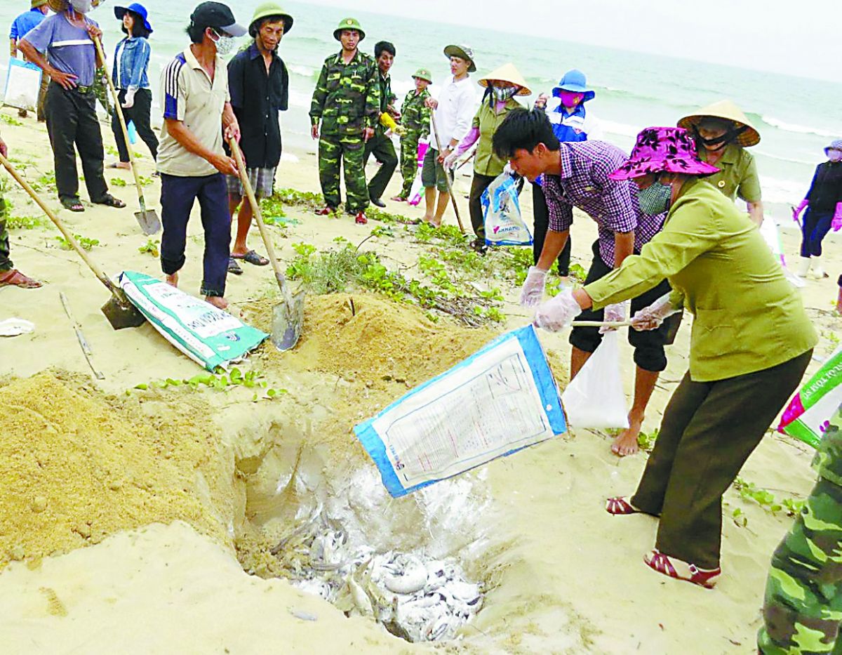 4月,越南渔民在海滩上掩埋死鱼。台塑集团在当地投资的河静大炼钢厂被指制造了污染。