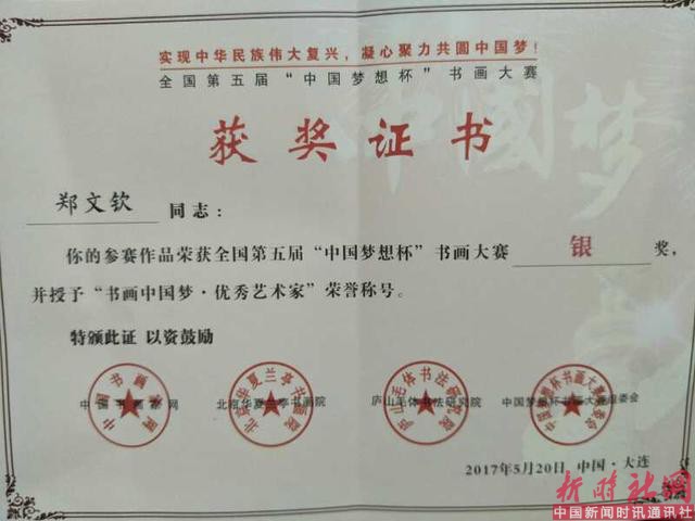 站长杨文阁报道:日前,书法家郑文钦在全国第五届《中国梦想杯》书画比赛中摘获银奖,这是郑文钦先生近期连续荣获的第五项大奖。