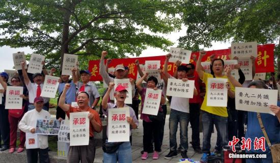 5月25日,台湾双北计程车(指台北市和新北市出租车)司机要九二共识、增加陆客、维持生计促进会,在位于台北的民进党中央党部外集会,呼吁当局承认九二共识,以增加大陆游客来台。 中新社记者 邢利宇 摄