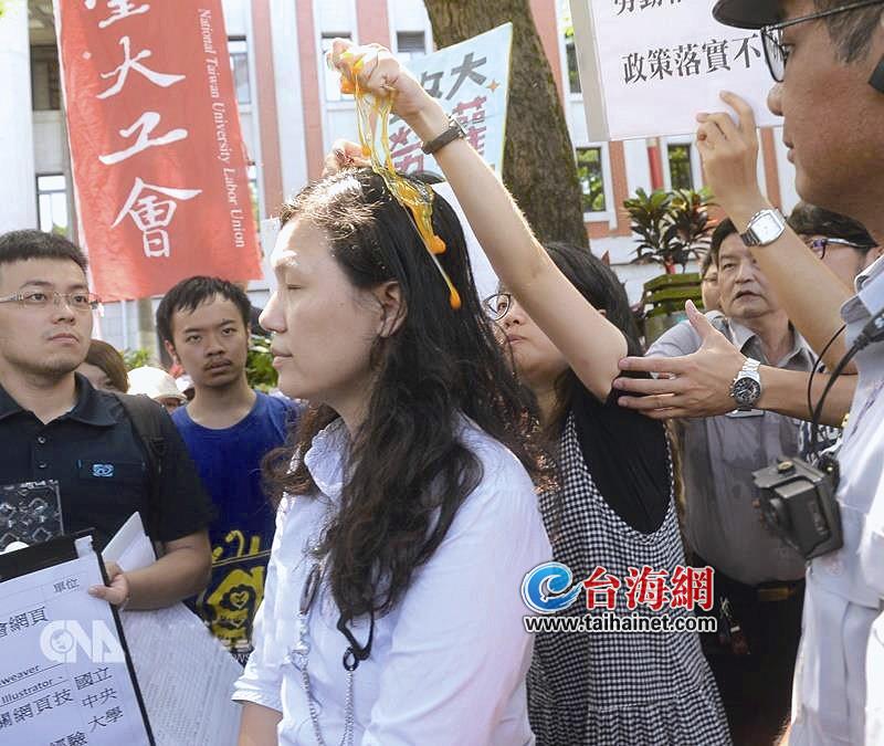 据台湾中央社7月4日报兼任助理纳保的争议在岛内延烧超过一年,劳工团体和学生代表不满没得到满意答复,4日到台当局教育部门前扔鸡蛋抗议。