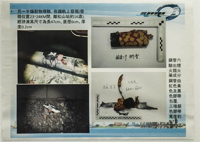 此外,鉴识人员也针对迹证报告指出,掉落在座位上和车体外的爆裂物,上面都有黑色胶带包覆着红色胶带,最外面还有黄色块状胶带。两部分的钢管合起来约有47厘米,可以装填火药量500至1000克。