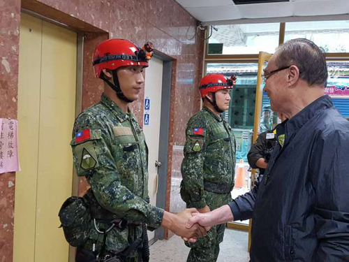 台防务部门负责人冯世宽8日上午10:30时亲赴新北市乌来区公所,除颁发加菜金外,更紧握官兵护卫家园的手,为官兵们加油打气,同时殷切叮咛干部务必在安全前提下,妥善照顾官兵。