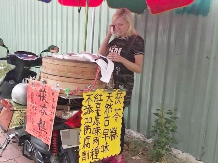 据台湾媒体报道,茯苓糕是闽南民间传统手工美食,常可见摊贩推车贩卖,但如果是金发碧眼的俄罗斯女子贩卖,画面一定很冲突,担任生命礼仪师的廖凯蓁日前开车行经台湾新竹竹北附近,看到这幅景象,立马停车购买,她说,摊主普通话超标准,糕饼很Q不黏牙,很好吃,她还拍照上传跟大家分享。
