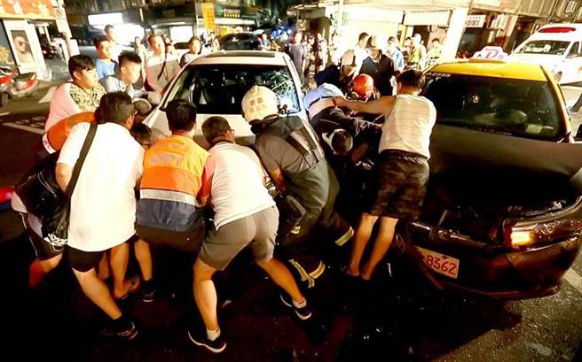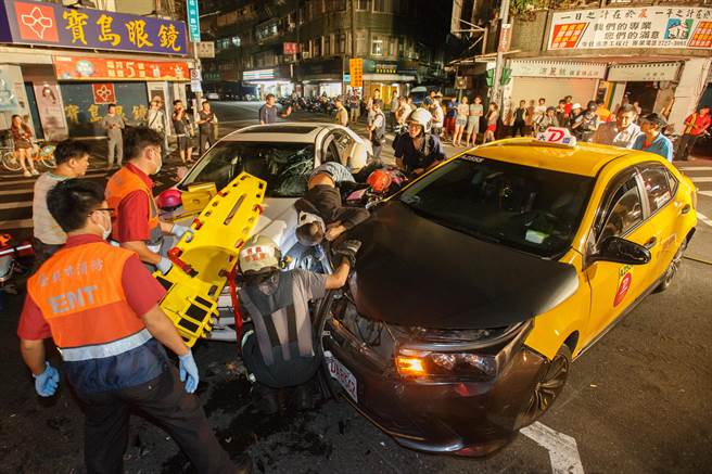 四周的路人也一同前来以人力将自小客车搬开,救护人员随即将骑士送往北医救治。(图片来源:台湾《中时电子报》)