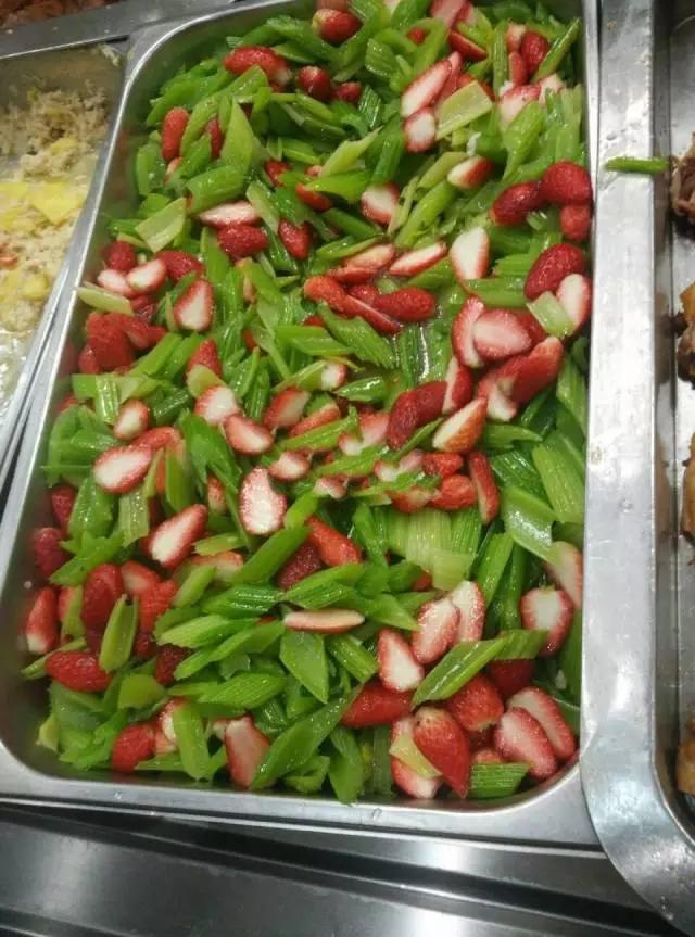 一道草莓炒西芹,道出了食堂阿姨的奢侈。这草莓多贵啊。