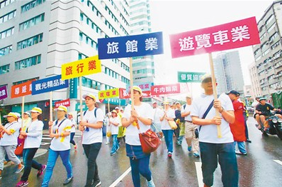 陆客骤减冲击岛内游览车业、旅馆业,为改变现状,岛内业者被迫走上街头,表达诉求。资料图片