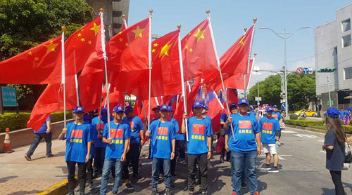 中华统一促进党新闻联络人胡大刚给《环球时报》提供了出发前队伍集结的照片,记者看到,参与游行人员高举五星红旗,身着胸前有五星红旗及我的国旗字样的蓝色T恤。据台湾媒体报道,中华统一促进党张安乐在接受采访时称,中华民国如今已成卖国集团的护身符,只剩下一个招牌,两岸若要和平相处,就必须拥抱中华人民共和国。