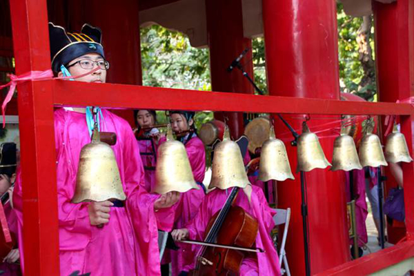 学子在祭孔大典上鸣钟鸣击鼓。(图片来源:台湾中国时报)