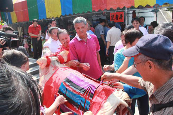 典礼以民间祭祀神明的传统礼仪及牲礼供品为主,祭圣大典仍有全猪和全羊,今年不同往年的是,祭典后最热闹的拔智慧毛,是以圆珠笔排列在布上,再披到猪羊身上,因此小朋友和家长拔到的智慧毛,是实用的圆珠笔。