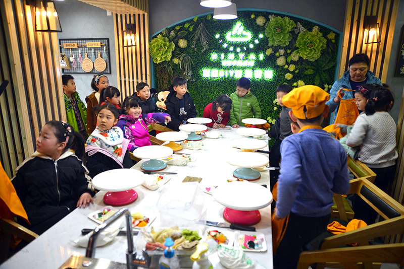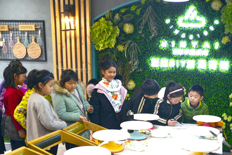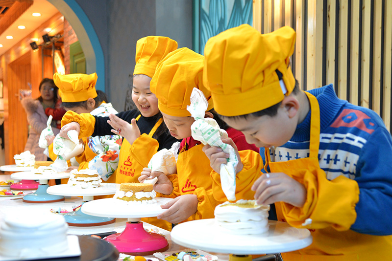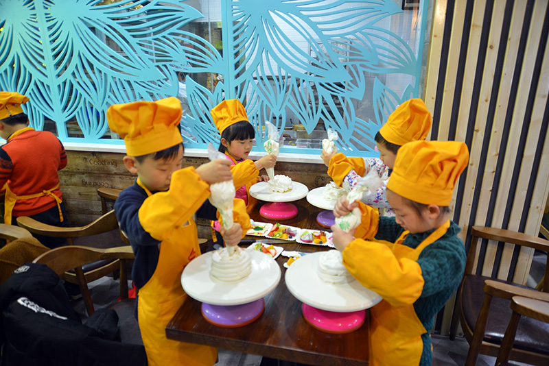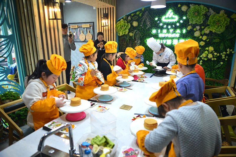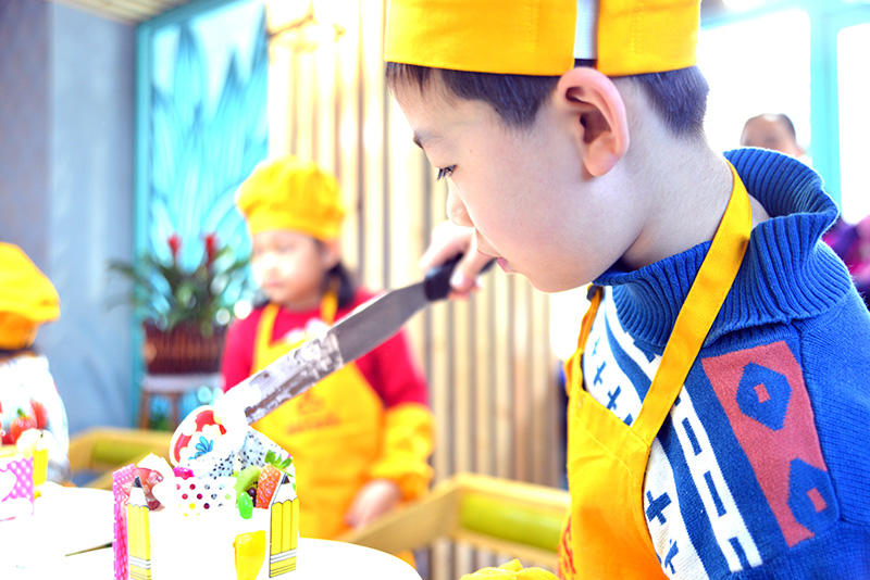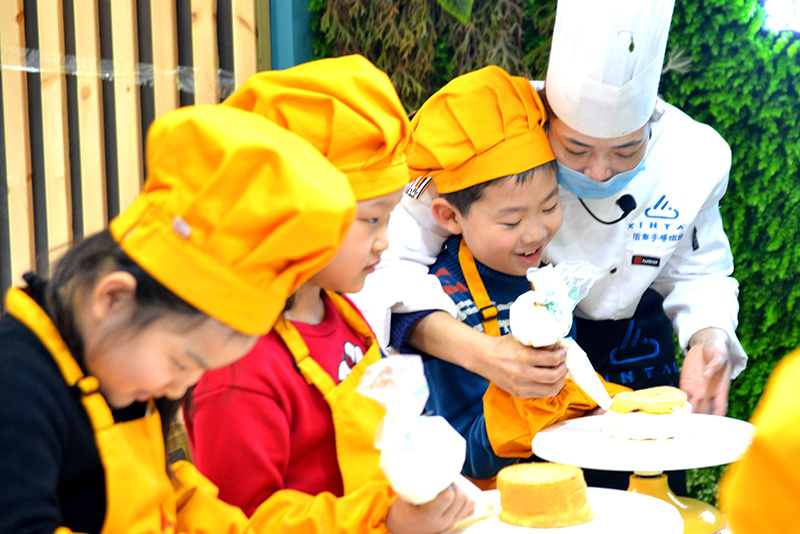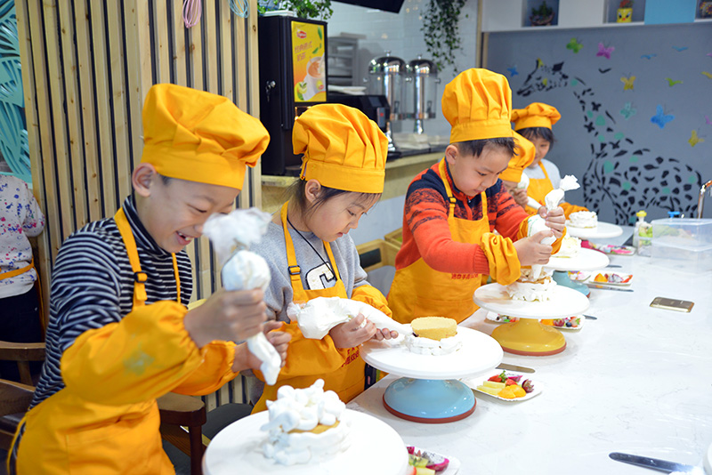 在老师的指导下,孩子们开始动手自己制作蛋糕。
