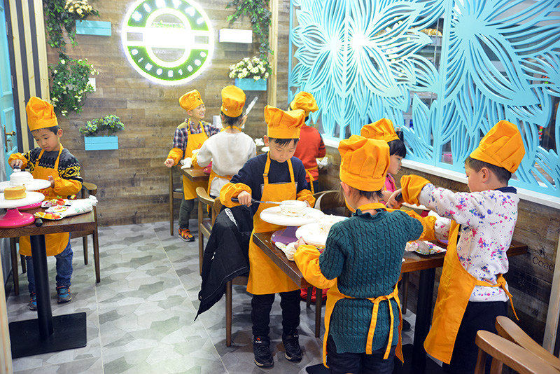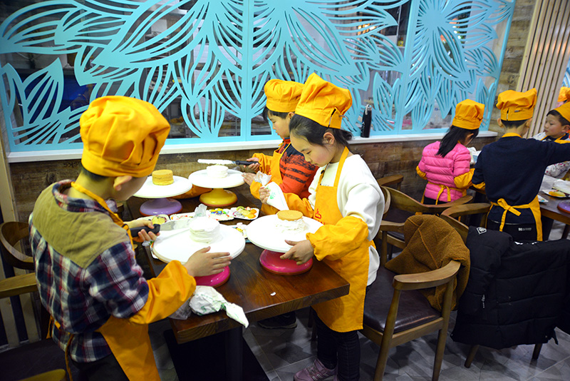 老师在讲解各种工具的名称和用途;小朋友们在认真听讲,他们学会了蛋糕的制作方法,下边就该动手实践了。