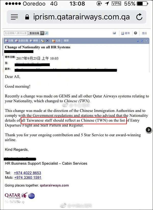 报道称,台涉外部门3日上午举行例行记者会,亚西及非洲司司长陈俊贤称,现在约有100多名台湾人在卡塔尔航空担任空服员,本来登记证国籍都写Taiwanese,但9月时,明显因为中国大陆施压,被改为Chinese(TWN)。