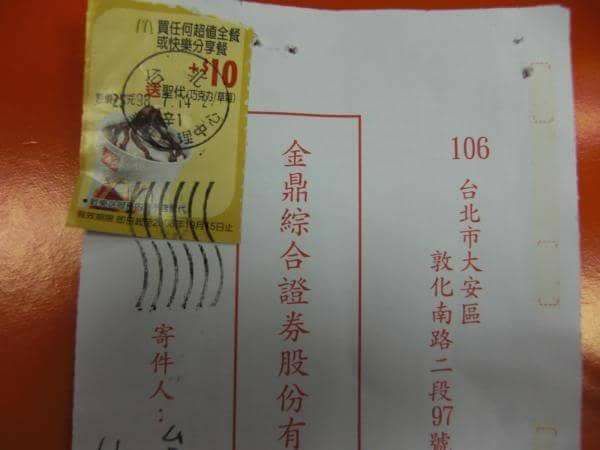 从台湾网友12日在脸书社群爆笑公社分享的照片中可以看出,一封寄给金鼎综合证券公司的信件上大剌剌地贴着麦当劳圣代优惠券,还写着买任何超值全餐或快乐分享餐+$10送圣代,还有一个巧克力圣代的照片,而优惠券上也盖著邮局处理中心认证的邮戳。