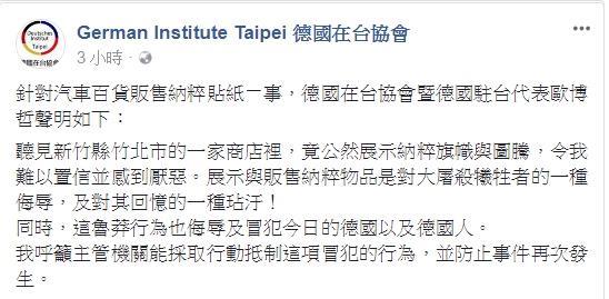 17日下午,欧博哲透过脸书平台德国在台协会粉丝专页发表声明。他表示,展示与贩卖纳粹物品是对大屠杀牺牲者的侮辱,并呼吁台当局能采取行动抵制这项冒犯的行为,并防止事件再次发生。