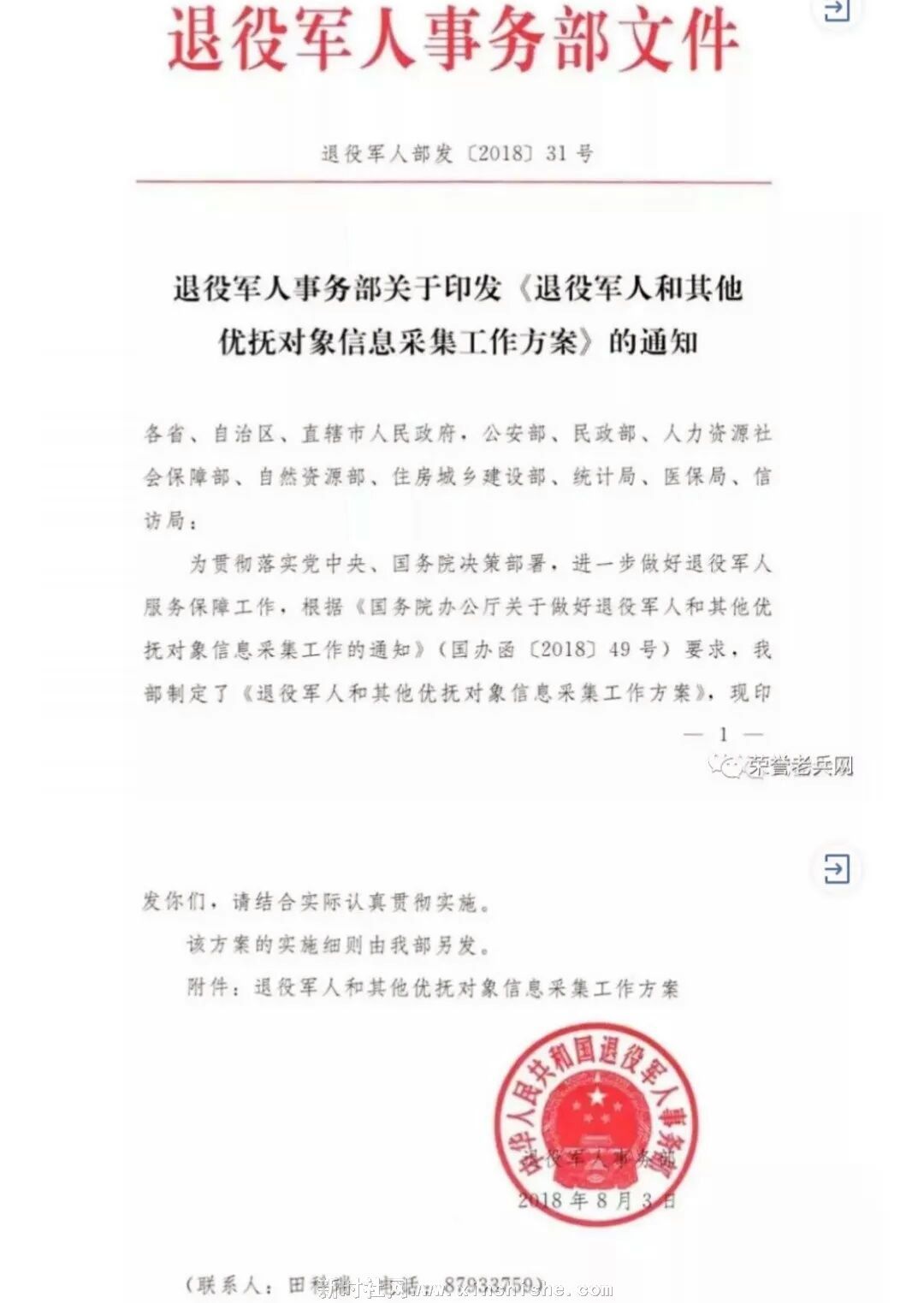 首先,退役军人事务部下发了《退役军人和其他优抚对象信息采集工作方案》的通知,对全国退役军人、烈士遗属、因公牺牲病故军人遗属、现役军人家属等退役军人事务部服务管理的所有相关人员。采集内容,不仅包括了个人基本信息、生活状况、享受待遇、还包括主要诉求,由本人反映的具体问题、存在的困难等。这次信息采集,可以说史无前例。
