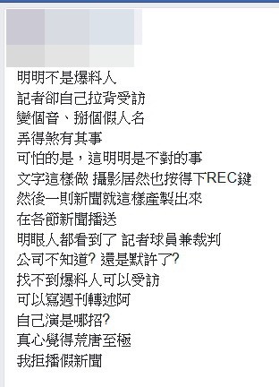 不过,当电视台女同事播报新闻时,意外发现视频中的爆料人竟然是自己的同事。而该名男记者刻意背对屏幕、拉低声音,假装是受访者。走下播报台后,女主播一怒之下在脸书发帖,并怒怼:找不到爆料人受访,可以写周刊转述啊,自己演是哪招。她还表示,整件事都荒唐至极,我拒播假新闻!
