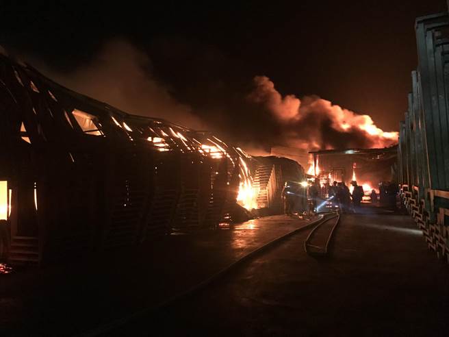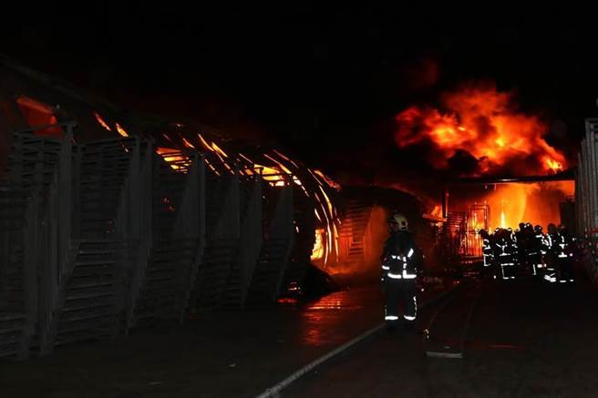 七股三股里蔬菜批发工厂存放红葱、蒜头的仓库22日晚间突然窜火,仓库全面燃烧,起火原因已由台南市消防局火调科进一步厘清。(图片来源:台湾《中时电子报》)